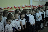Dnia 10.11.2015 wszystkie grupy przedszkolne zgromadziły się w jednej sali by wraz z zaproszonymi gośćmi przeżywać obchody związane z dniem odzyskania przez Polskę niepodległości. To ewenement w naszej placówce, gdyż nigdy wcześniej takie wydarzenie nie miało miejsca. Na Apelu byli obecni: zastępca burmistrza p. Włodzimierz Tokarczyk, p. dyrektor ZSP – Andrzej Gancarz, pani dyrektor – Janina Dziedzina, przedstawiciele Straży granicznej – p. Bołoz i p. Szyszka oraz młodzież z gimnazjum ZSP w Muszynie, grono pedagogiczne, obsługa a także rodzice z przedszkola w Muszynie. Pierwszym punktem było wprowadzenie Sztandaru. Później wszyscy odśpiewaliśmy hymn Polski. Były wiersze, piosenki, pogadanka n.t. losów Polski i okoliczności odzyskania przez Polskę niepodległości i symboliczne złożenie wiązanki kwiatów pod pomnikiem Bohaterów Miasta Muszyny.
