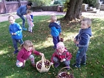 Po obiedzie w słoneczny październikowy jesienny dzień 4-latki udały się na spacer do ogrodu „Wanda” , gdzie rosną olbrzymie kasztanowce. Naszym celem było zebranie kasztanów oraz kolorowych liści do koszyków . Dzieci jeszcze nigdy nie widziały takiej ilości kasztanów. Zebraliśmy je i udaliśmy się do przedszkola gdzie zaczęliśmy tworzyć kompozycję na dywanie , na drugi dzień zaczęliśmy naszą „kasztankową grę”.
